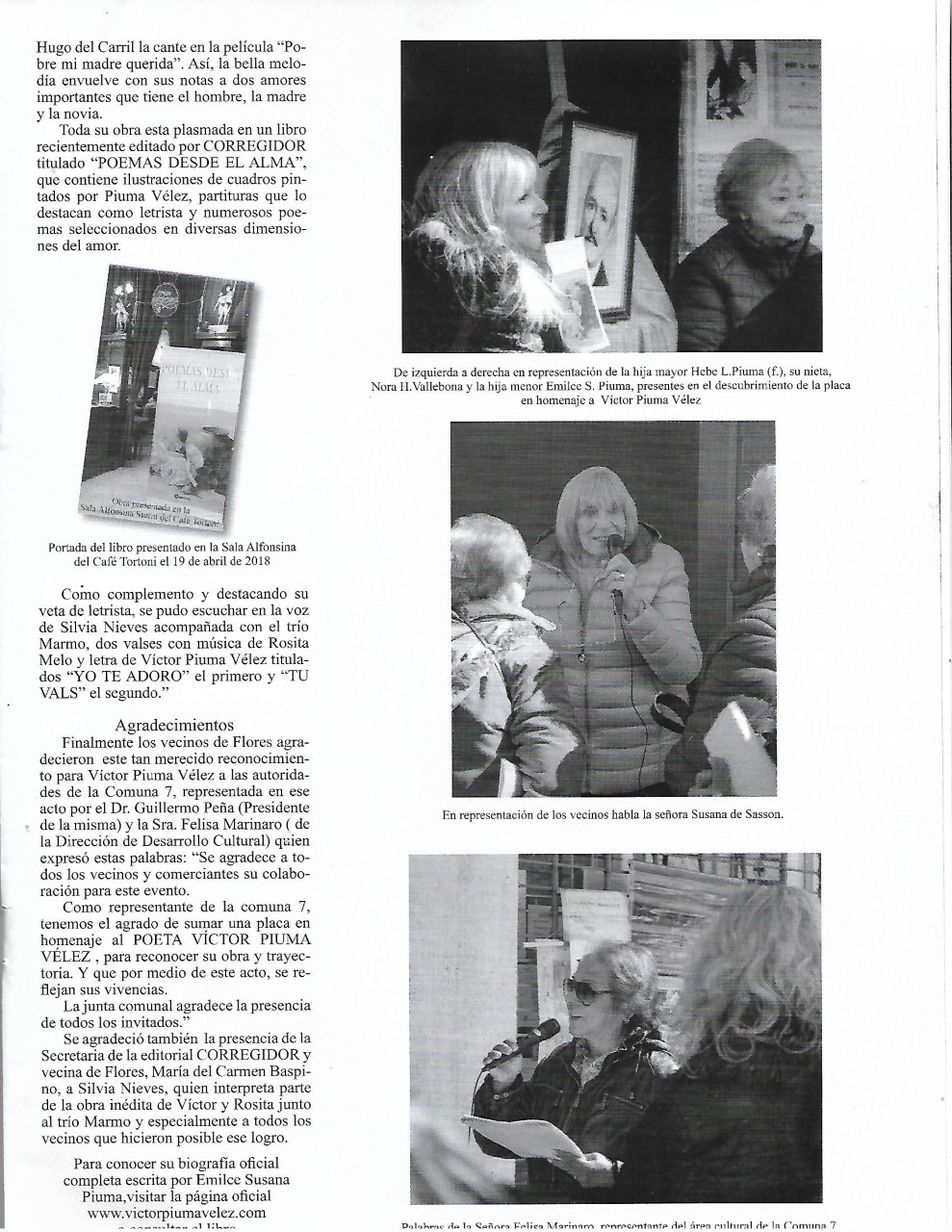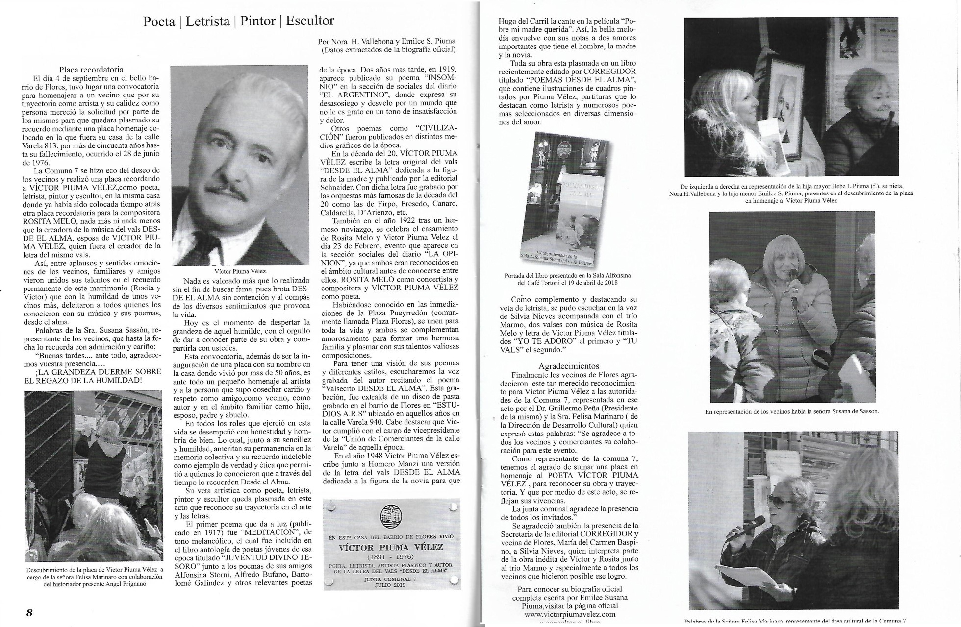 AÑO 2019: Homenaje a Víctor Piuma Vélez. Se colocó una placa en reconocimiento a su trayectoria artística con la iniciativa del Área Cultural de la COMUNA 7 de la Ciudad Autónoma de Buenos Aires mediante un acto ocurrido frente a la casa en que habitó por más de cincuenta años junto a su esposa Rosita Melo, calle Avda. Varela 813 en el hermoso barrio de Flores. Así, compositora y poeta no solo crearon obras inolvidables como el famoso vals Desde el Alma (música de Rosita Melo y letra de Víctor Piuma Vélez) sino que además cosecharon el cariño incondicional de todos sus vecinos que siguen recordándolos.