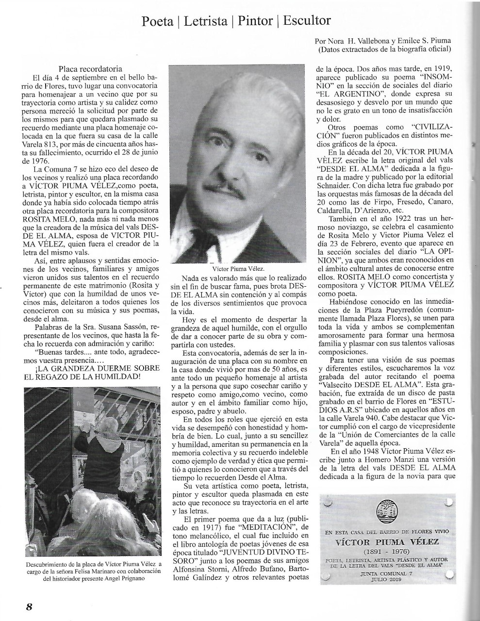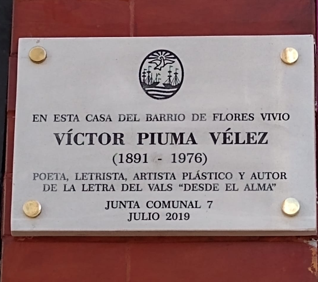 AÑO 2019: Homenaje a Víctor Piuma Vélez. Se colocó una placa en reconocimiento a su trayectoria artística con la iniciativa del Área Cultural de la COMUNA 7 de la Ciudad Autónoma de Buenos Aires mediante un acto ocurrido frente a la casa en que habitó por más de cincuenta años junto a su esposa Rosita Melo, calle Avda. Varela 813 en el hermoso barrio de Flores. Así, compositora y poeta no solo crearon obras inolvidables como el famoso vals Desde el Alma (música de Rosita Melo y letra de Víctor Piuma Vélez) sino que además cosecharon el cariño incondicional de todos sus vecinos que siguen recordándolos.
